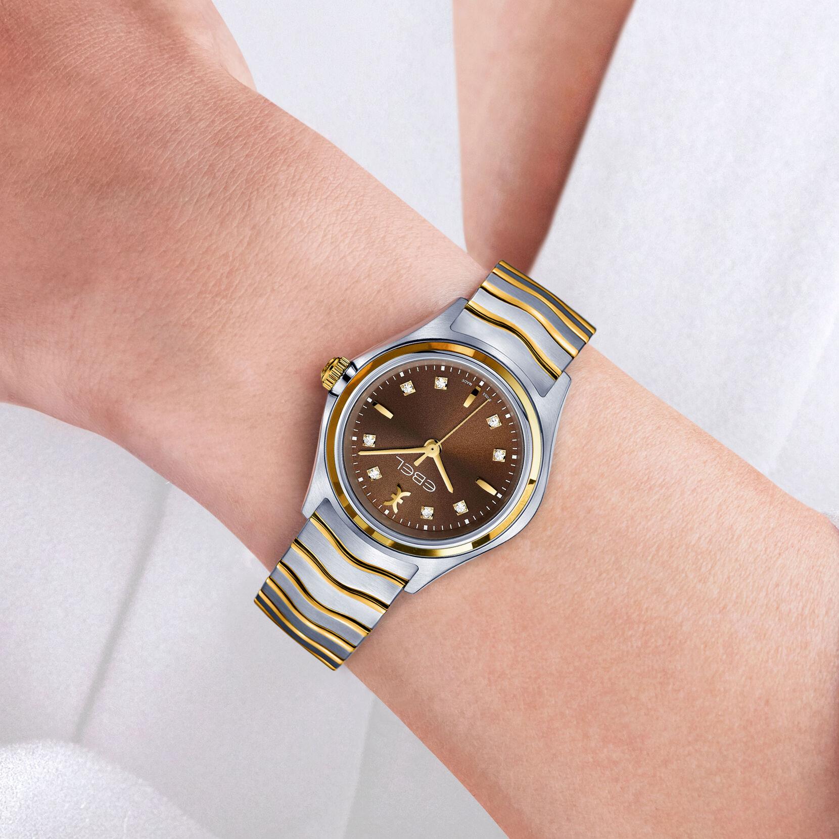 | تفاصيل اضافية | Women's EBEL Wave Lady watch, 30.0 mm stainless steel case with 18K yellow gold bezel and crown, brown galvanic dial with 8 diamond markers (0.052 t.c.w.) and applied EBEL symbol and indexes, brushed and polished two-toned stainless steel signature wave-l |