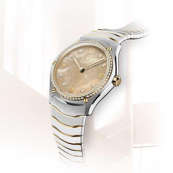 | تفاصيل اضافية | EBEL Sport Classic Women's EBEL Sport Classic Lady, Stainless steel and 18K yellow gold case with 59 diamonds (0.384ct), Ø 33mm, beige mother-of-pearl dial with applied Roman numerals and 8 diamonds (0.052ct), sapphire crystal with antireflective treatme |