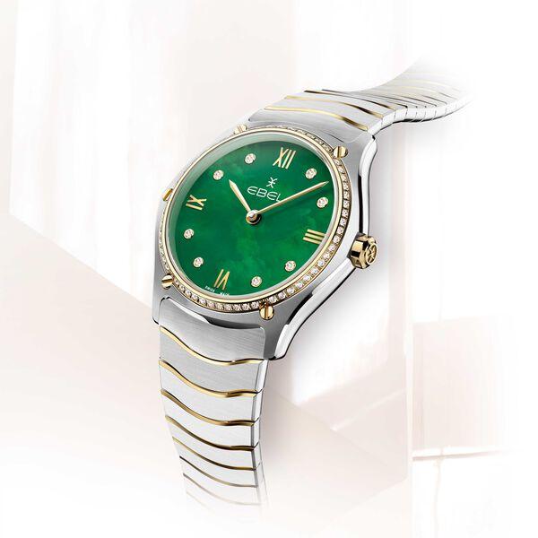 | تفاصيل اضافية | EBEL Sport Classic Women's EBEL Sport Classic Lady, Stainless steel and 18K yellow gold case with 59 diamonds (0.384ct), Ø 33mm, green mother-of-pearl dial with applied Roman numerals and 8 diamonds (0.052ct), sapphire crystal with antireflective treatme |