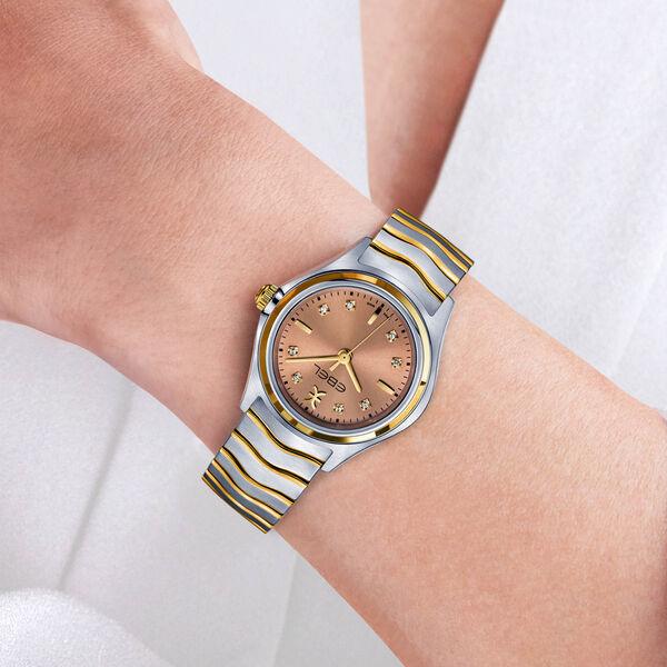 | تفاصيل اضافية | EBEL Wave Women's EBEL Wave Lady watch, 30mm stainless steel case with 18K yellow gold bezel and crown, pastel brown galvanic dial with 8 diamond markers (0.052 ct.), applied EBEL symbol and indexes, brushed and polished two-toned stainless steel signatu |