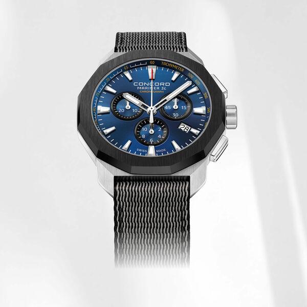مادة السوار "Stainless steel with black ceramic bezel, blue dial additional black rubber strap"